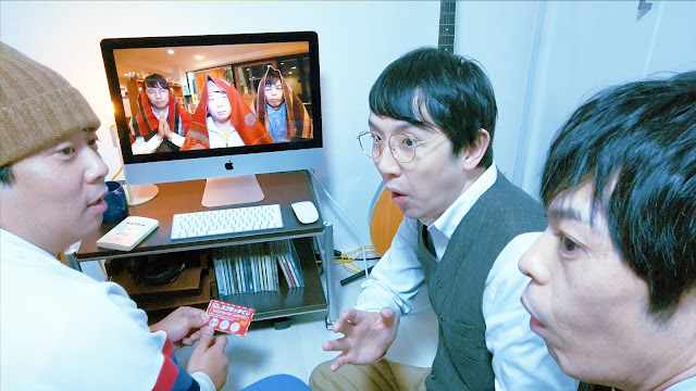 The whole of Beyond was apparently filmed on an iPhone and the whole film has a simulated look to appear as if it was all filmed in a single take. Obviously there would be breaks as filming an entire seventy minute film would be nigh on impossible in a single take, but it is impressive and never becomes obvious when a shot has changed. I found this more impressive than One Cut of the Dead as that changed into something far different later on, but here, this notion of one single take is stuck with all the way to the end. The flow of the story has Kato and friends constantly walking up and down the stairs in order to both speak to their future selves, and then go and act out their future selves talking back to the past. By necessity this caused a lot of repetition, but it was so clever, especially when things don't always turn out as expected. An early example is when future Kato is told by his older self to go and ask out the neighbour he fancies. He had always been too scared of rejection to do this, but is given confidence by his future self, only to do so and get rejected. Not wanting to disrupt the time flow he then pretends to his younger self that he was successful. This becomes one of the more interesting aspects of Beyond with characters being compelled to parrot their interactions out of a feeling of not wanting to cause a time paradox, rather than having an actual desire to do so, bringing up the idea of free will, or a lack of one.